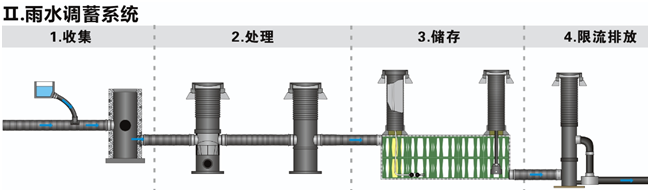 主要用于市政雨水的调控和排放,该系统具备雨水收集、储存、输送功能,能对储存雨水进行限流缓排,具有雨水调蓄、削减洪峰、减轻管网排水压力等作用,缓解城市内涝。