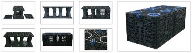 利用PP塑料加工而成并可用于雨水储存空间的实体结构单元,可组装为箱体结构,我司模块分为A型和B型。