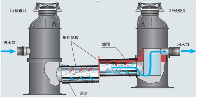 装置的两端为两个专用功能井,中间通过专用油泥分离管道连接,当收集雨水通过该装置时,达到泥沙和油污分离的效果。